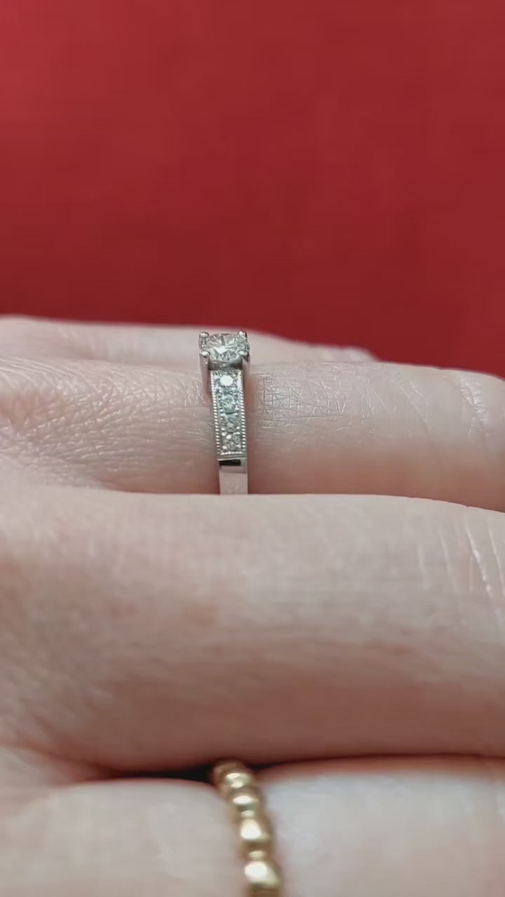 La versión más deslumbrante de nuestro anillo de compromiso Clásico DV Joyas. Tiene un diamante central de 28 puntos y los laterales van en descenso de tamaño, lo cual pensamos le da un toque elegante y discreto. Conmemora 40 años con 40 puntos de diamantes. ¡Hecho para impresionar y celebrar!