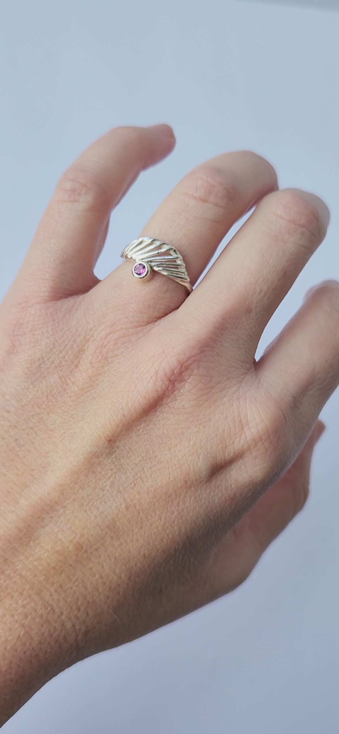 La serie NIÑA nace del recuerdo de un dibujo que siempre hacía en la infancia mientras jugaba a rayar sobre un papel el mismo patrón de líneas, durante llamadas telefónicas, eternas clases de colegio, etc. Eso me daba calma y paz. El anillo Niña Piedra es cómodo y elegante. Muy agradable de sentir en la mano y la piedra otorga luz y destellos.